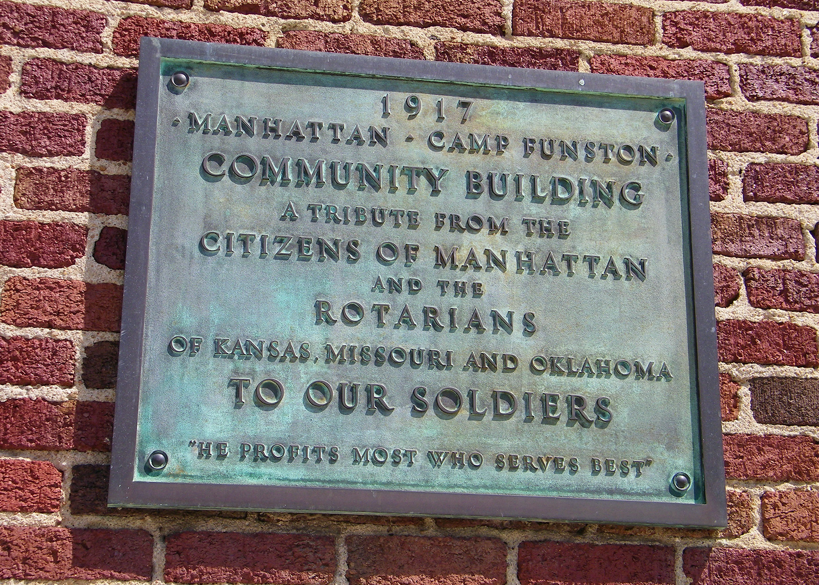 The Community House is a brick building, which was designed as a recreation center for soldiers. It has a bronze plaque mounted to the right of the front door that reads, "1917 Manhattan - Camp Funston Community Building, A Tribute From The Citizens Of Manhattan And The Rotarians Of Kansas, Missouri And Oklahoma To Our Soldiers, ‘He Profits Most Who Serves Best.’” In 1941, the Community House was “permanently dedicated to the soldiers of that war,” meaning World War I.