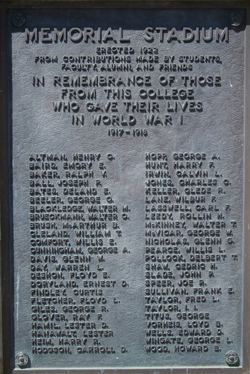 The stadium was constructed in the 1920s to honor the 48 Kansas State students and alumni who died in World War I. It was originally intended to be a horseshoe design, but the arc of the horseshoe was never completed, and it was not dedicated. In April 2017 on the 100th anniversary of the U.S.’s entry into World War I, Memorial Stadium was officially dedicated. The stadium was the first memorial on campus. Identical plaques commemorating veterans are located on the south ends of both West Stadium and East Stadium.