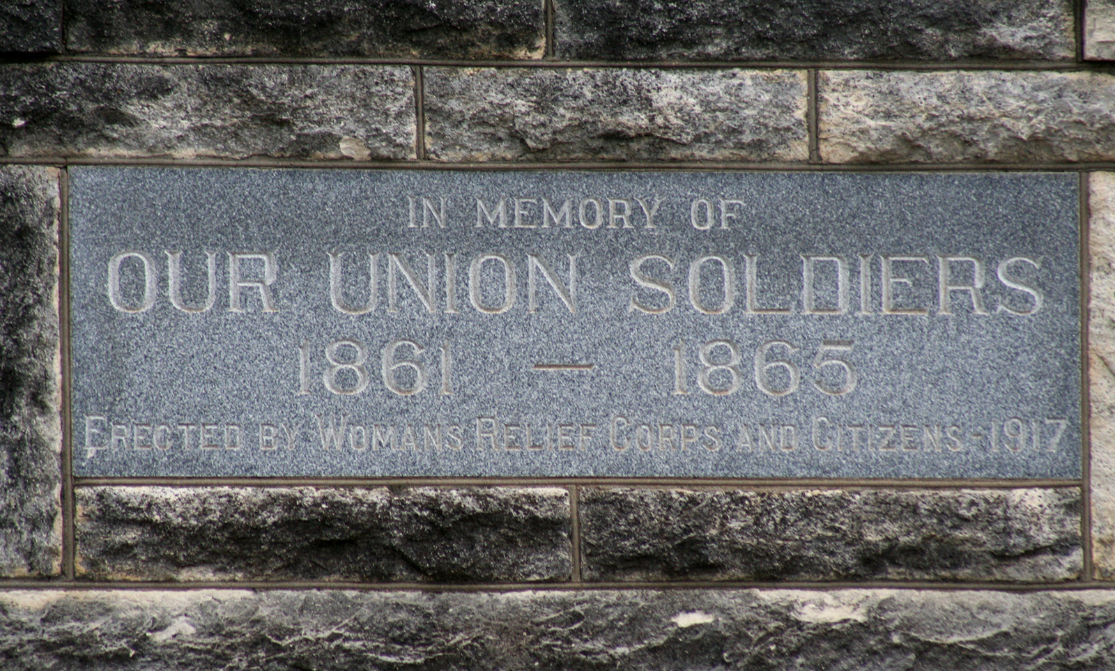 The memorial arch provides an entrance to the cemetery. A stone tablet above the left entryway is inscribed, "In Memory Of Our Union Soldiers 1861-1865 Erected By Womans Relief Corps And Citizens - 1917.”
