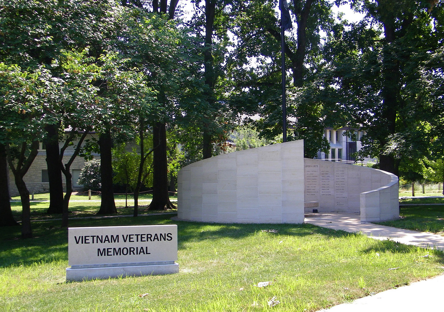 The memorial honors the students who served in the Vietnam War. In 1986, students launched a campaign to raise $22,000 for the memorial. Construction began in August 1989 and the memorial was dedicated in November 1989. The memorial features two semicircular limestone walls that are 20 feet in diameter. One of the walls bears the engraved names of 42 students who died in the war or who are missing in action. The other wall bears an inscribed quote from Abraham Lincoln. Benches and an illuminated flagpole rise in the memorial's center.