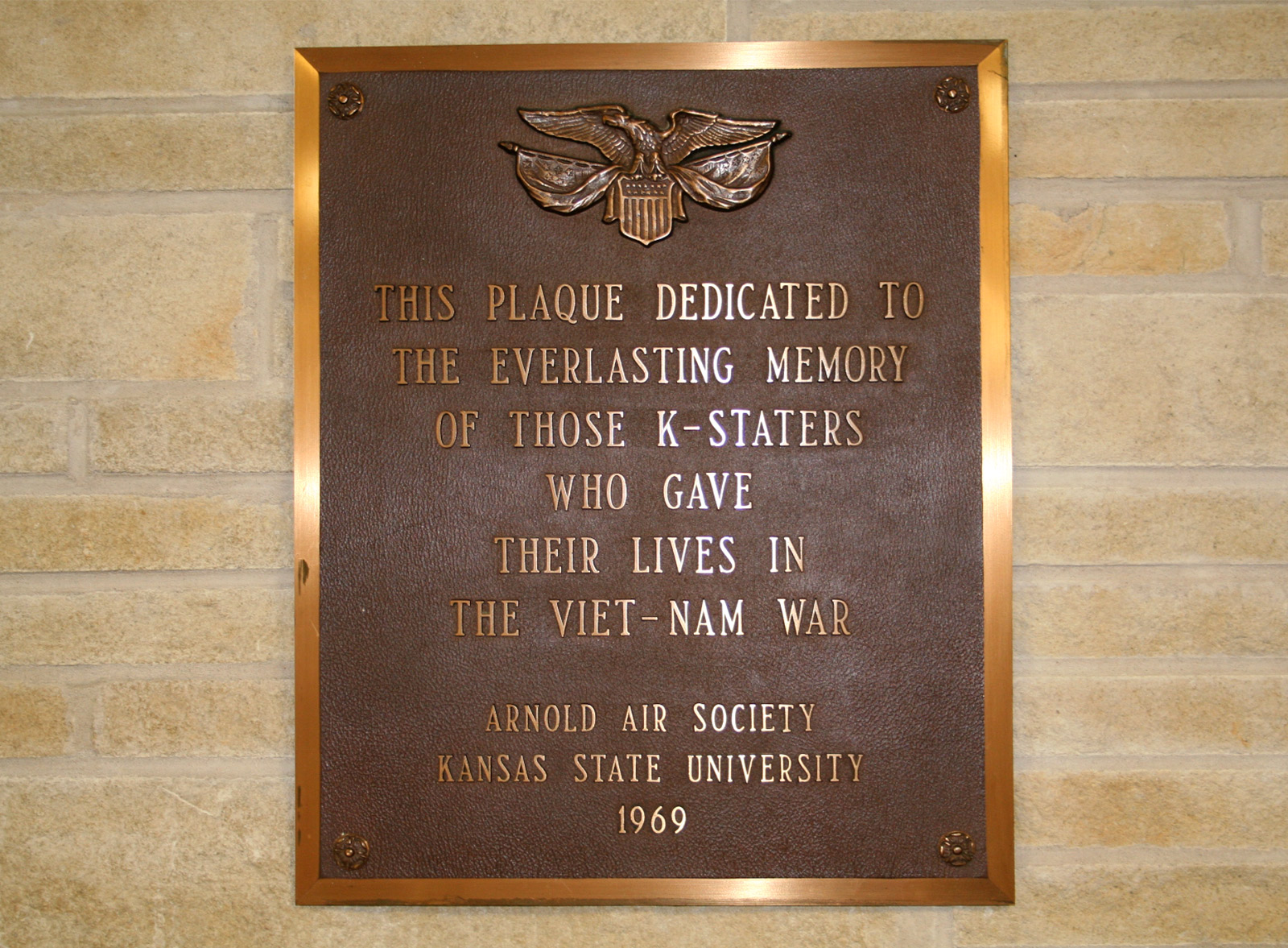 Before the Vietnam Veterans Memorial was built, a memorial plaque was donated to the university in 1969 and placed on the first floor of the K-State Student Union to honor those students who died in the Vietnam War. In 2017, the plaque was moved to outside the Veteran’s Resource Center on the second floor.