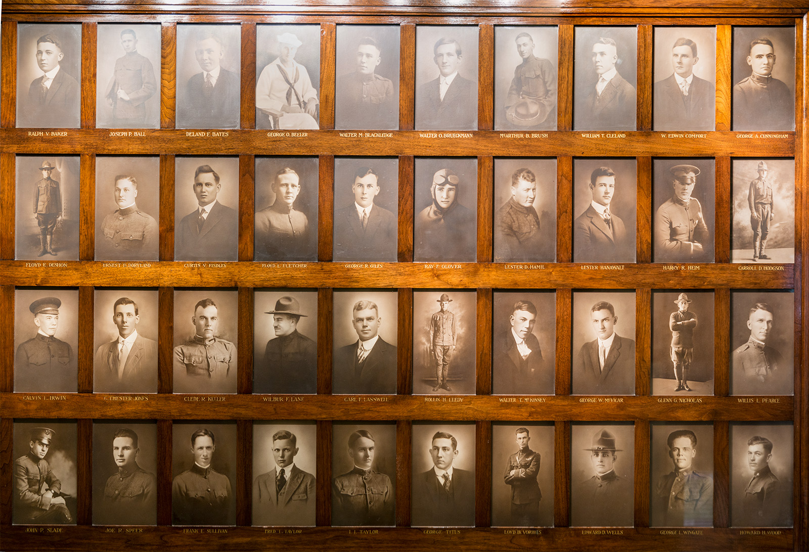 The World War I Memorial Wall, with the title "1917 – Lest We Forget – 1918," is in the lower level hallway of Gen. Richard B. Myers Hall. The memorial includes the portraits of the 48 K-State men who died in World War I.