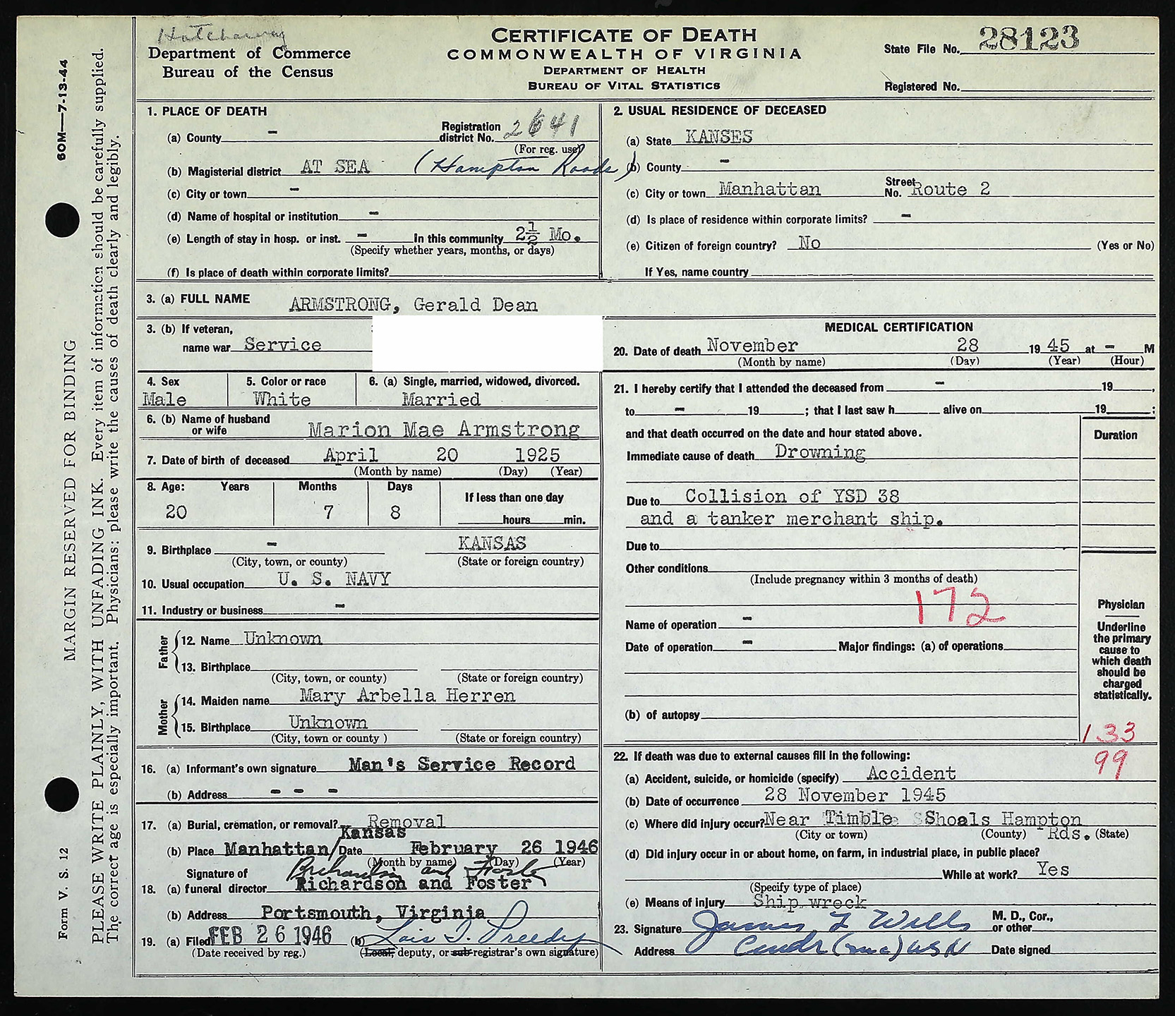 Bio: Gerald lived with his family in rural Manhattan and attended Manhattan High School. He enlisted in the Navy, served in the South Pacific, and was awarded the APTO Ribbon. He was killed in a collision of a tanker and an airplane salvage derrick in Virginia.