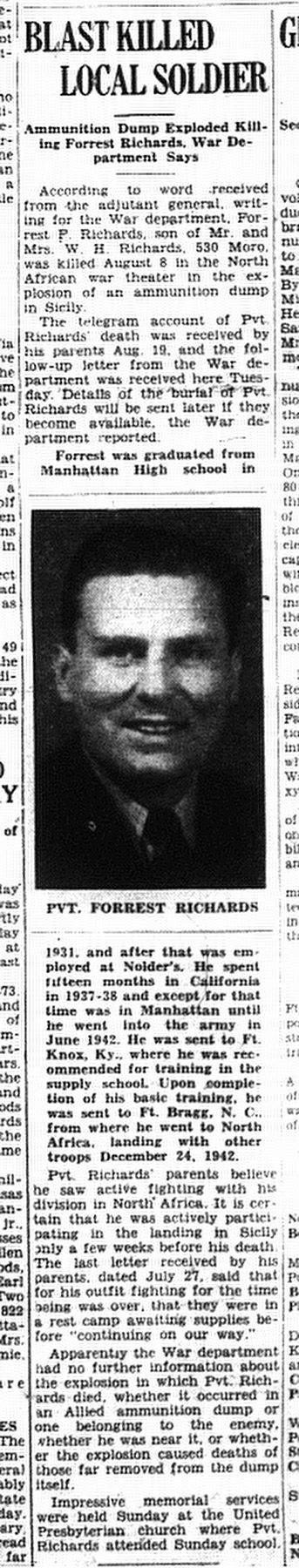 Bio: Forrest was born and raised in Manhattan, Kansas. He joined the Army in 1942 and landed with American Forces in Africa on December 24, 1942. Fought through to Sicily where he died in an accident at a rest area waiting on replacement equipment.