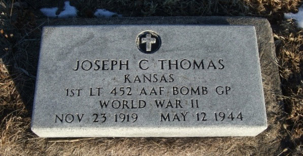Bio: Joseph Charles Thomas was born on November 23, 1919 in Madison Twp., Riley Co., Kansas. to Glenn Andrew Thomas, Sr. and Mary Louisa (Johnson) Thomas. He was raised to adulthood in Riley County. On April 10, 1942, Joseph entered the Army Air Forces. He became a 1st Lieutenant attached to the 729th Bomber Squadron, 452nd Bomber Group, 8th Air Force. Joseph was assigned as a Pilot for the B-17G Bomber stationed at the Army Airfield, Deopham Green, Norfolk, England.