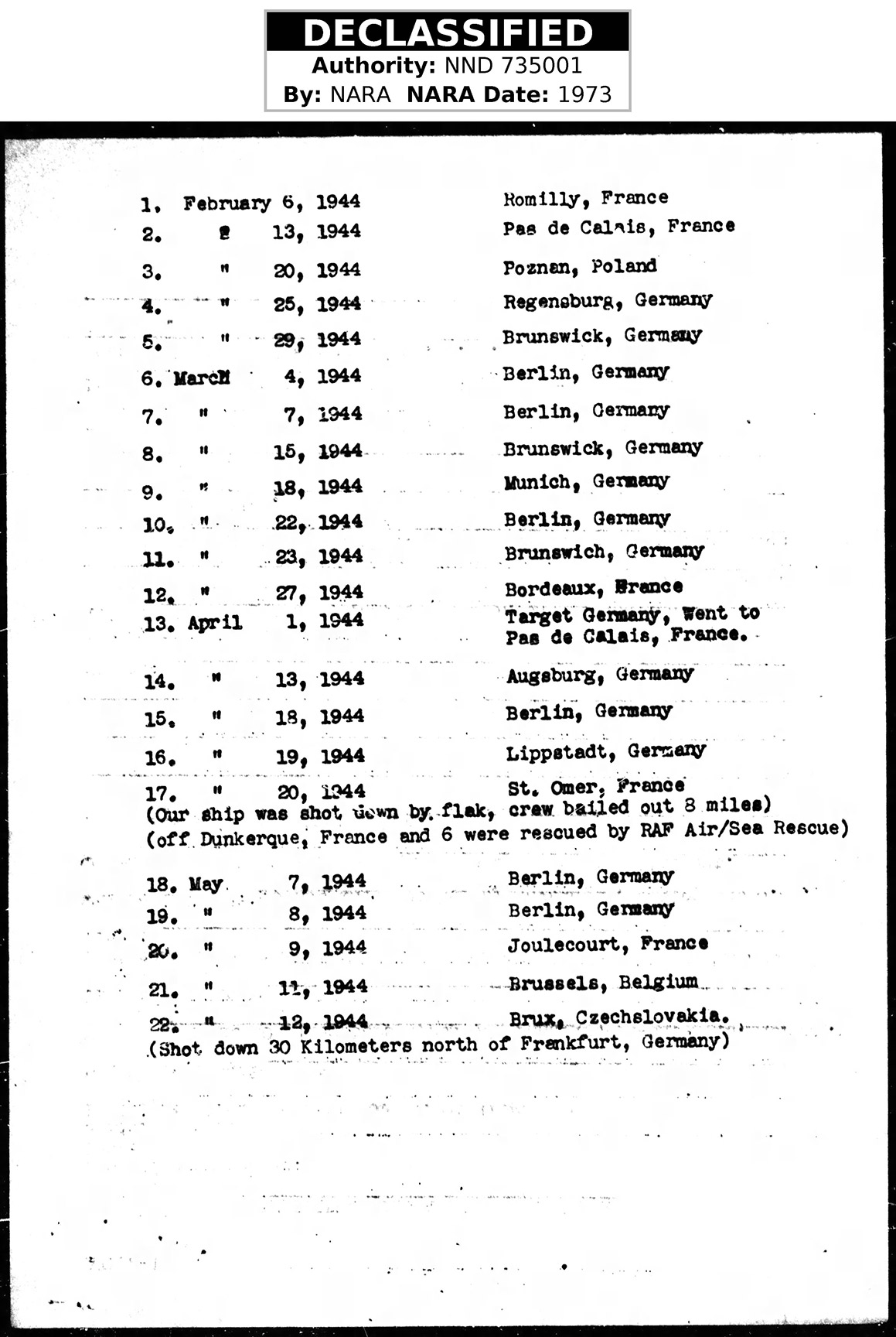 Joseph flew 22 total missions in B-17G Bombers. He was shot down April 20, 1944 in B-17G #4237956. Plane ditched in Channel. Returned to base. Shot down 12 May 1944 in B-17 #4297786 "The Hardway." Joseph was shot down by the enemy twice, the second being fatal. He had flown 4 other bombing missions in May of 1944. On May 7th and 8th 1944 he bombed targets in Berlin, Germany. On May 9th the targets were in Joulecourt, France. On May 11th they dropped their bombs in Brussels, Belgium. On the 5th mission, May 12, 1944, Joseph and crew were ordered to fly over and bomb a chemical plant located at Brux, Czechslovakia. His plane was hit by enemy fire en route. As the plane spiraled down toward the ground, 6 of the crew were able to bail out, including Joseph. Upon landing with their parachutes onto the ground, Joseph was killed by German small arms fire. The 3 remaining crew perished at impact. The 5 survivors were all taken to German POW camps.