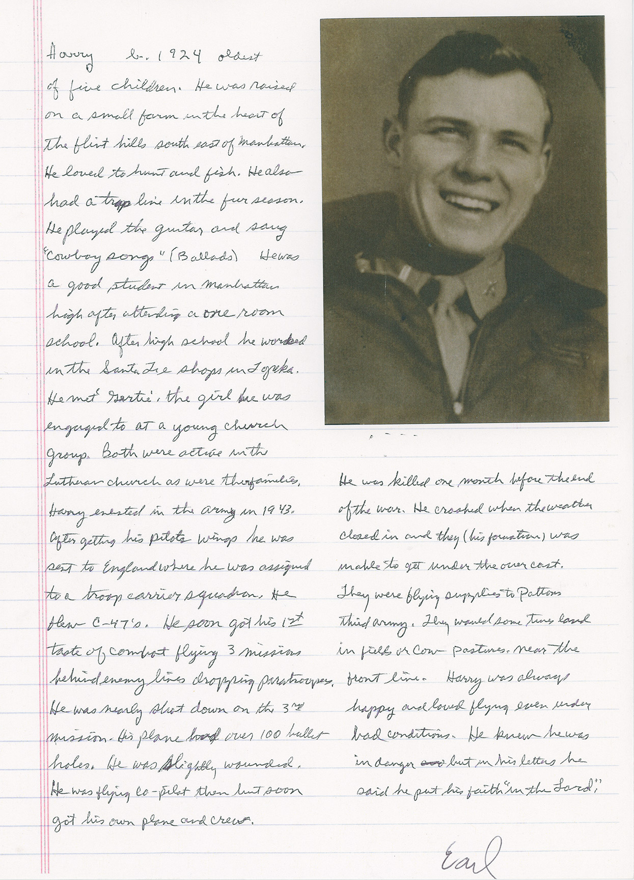 Harry was born on a small farm in the Flint Hills south of Manhattan. According to his family young Harry loved to hunt and fish, and sing and play “cowboy songs” on his guitar. Harry went to Manhattan High school as a teenager and, after graduation, went to work for the Santa Fe Company in Topeka. In 1943 nineteen year old Harry enlisted in the Army Air Corps and was sent to Salt Lake for his training. Before he left, though, Harry proposed to his girlfriend, Gertrude Beckmann, whom he had met at his local Lutheran church. Gertie said yes, and they were engaged to be married after the war.